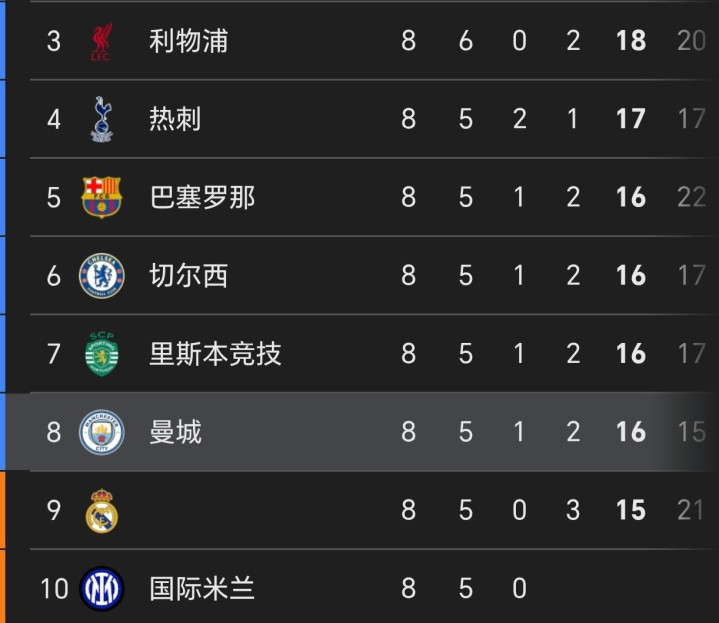比赛结束后,曼城一度因里斯本竞技和切尔西的末段进球,在第八名位置上岌岌可危——当时唯一能超越他们的只剩皇家马德里,只要皇马赢球,曼城就将无缘直接晋级。但戏剧性的是,皇马最终在客场2-4被穆里尼奥执教的本菲卡击败,而本菲卡门将阿纳托利·特鲁宾在补时阶段打入的第四球,彻底为曼城铺平了晋级之路。